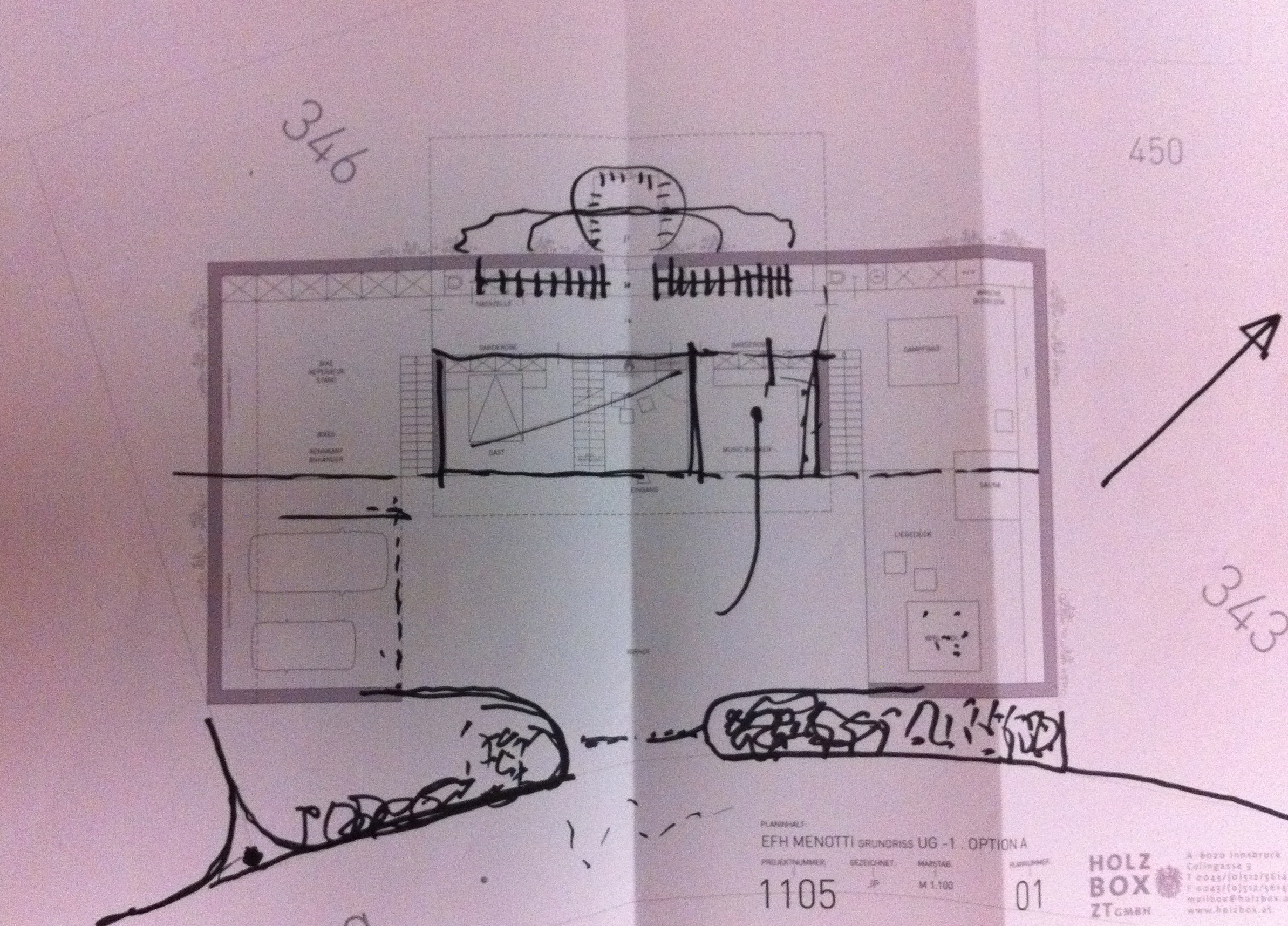 Bei einer Flasche Rotwein sitzen wir dann am Tisch und Armin zeigt mir die ersten Pläne. Er beginnt mit dem Untergeschoss mit dem Innenhofkonzept, nicht im kühnsten Traum wäre mir so etwas in den Sinn gekommen, ich weiss sofort dass wir das in der Art umsetzen werden. Die Weingrotte im Fels mit Kernbohrungen für die Weinflaschen ist natürlich der Brüller, mir kommt die Heineken Werbung mit dem begehbaren Heineken-Schrank in den Sinn, aber mein Keller ist definitiv kultiger. Wir diskutieren die beiden oberen Geschosse, das Hauptgeschoss wird bis zu 5 Schlafzimmer fassen mit 2 Bädern und einer Sauna. Beidseitig gibts die Möglichkeit ins Freie zu gehen. Auf der Talseite (Richtung Südosten) werden wir einen riesigen Raum mit flexibler Raumabtrennung umsetzen, damit bis zu 3 Kinder komfortabel und mit Wahnsinnsaussicht und super Besonnung Platz finden. Im Dachgeschoss gibts einen grossen Raum mit Küche, Ess- und Wohnbereich sowie einer grossen Terasse. Alles natürlich mit viel Glas und Aussicht auf grossen und kleinen Mythen. Ich glaube insgesamt sind 4 Feuerstellen geplant, 2 alleine im Wohnbereich. DER WAHNSINN 🙂
